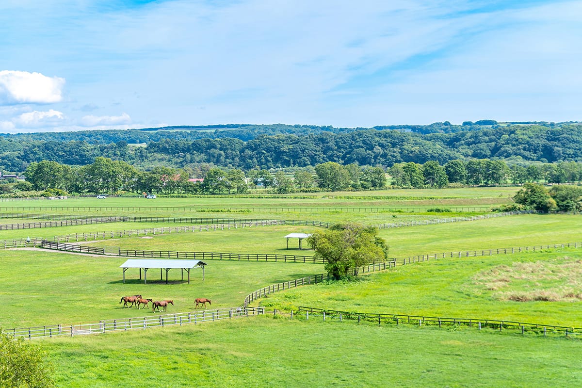 日高地方の中でも、中部に位置する新冠町には「サラブレッド銀座」と呼ばれる通りがあり、約8kmにわたってひたすら牧場が続くという圧巻の場所。見渡す限りの緑の牧草や、じゃれあっている馬を見ることができるのは、新冠町ならではです。