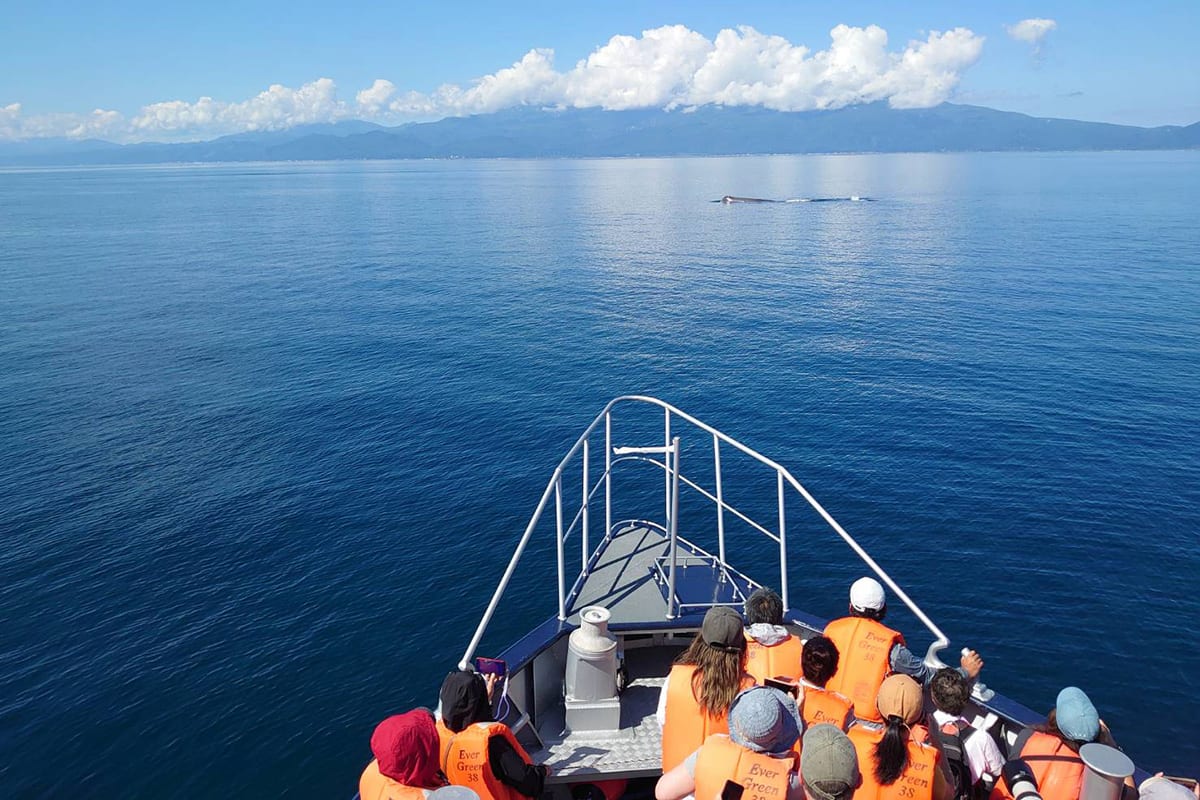 「クジラの中でもマッコウクジラは"クリックス音"というものを出すので、いる場所がわかりやすいです。海中にマイクを入れて確認し、音が止んだら浮上してくる合図なので、皆さんにお知らせします。クジラはパターンが決まっていて、40分深海にいて、7分浮上するというのを繰り返すんですよ」