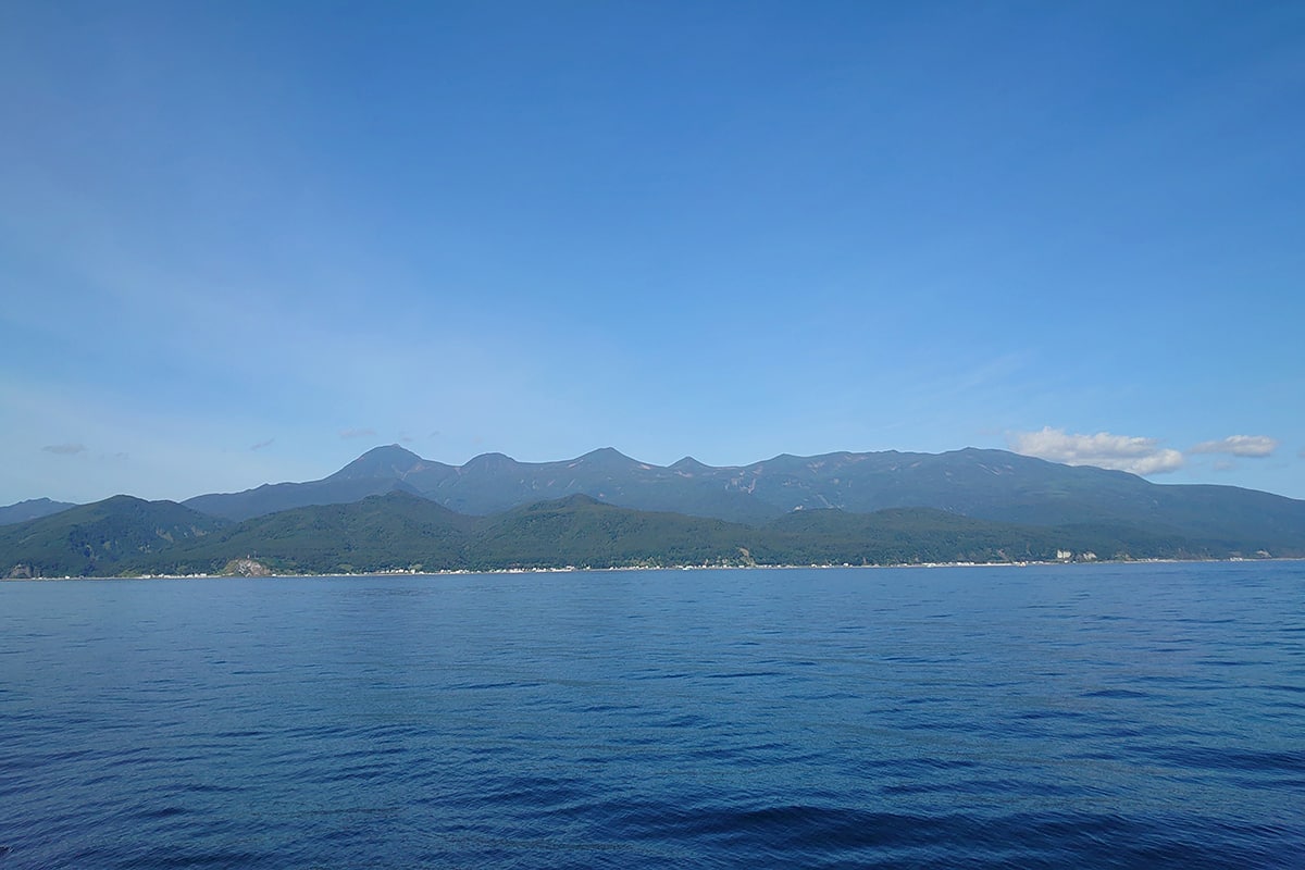 クルーズを楽しみながら目線を上げると、国後島がすぐ近くに見えることに気づきます。振り返ると船が出た漁港ははるか遠く。シャチやクジラに夢中になっているうちに、船はかなり沖まで進んでいるのです。