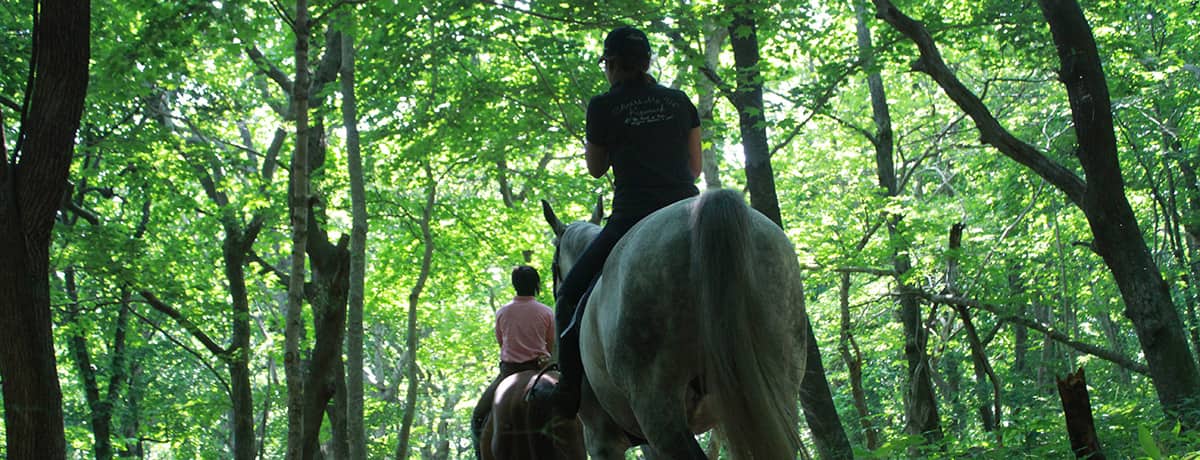 「最初に馬場で練習して馬に慣れてきたら森の中へ。馬に乗るだけで高さが変わるので、風の強さも違ってくるし、吸い込む空気もなんだか別のような気がしますよね。風景を眺めているだけでも時間を忘れられるという方が多いです。それに、馬に乗っていると野生の動物が逃げないので、意外と近くで見ることができます。人間ではなく、馬と意識してくれるせいか天敵と思わないのかもしれませんね。ここでは、鹿やキツネ、キジなどは頻繁に会えますよ」