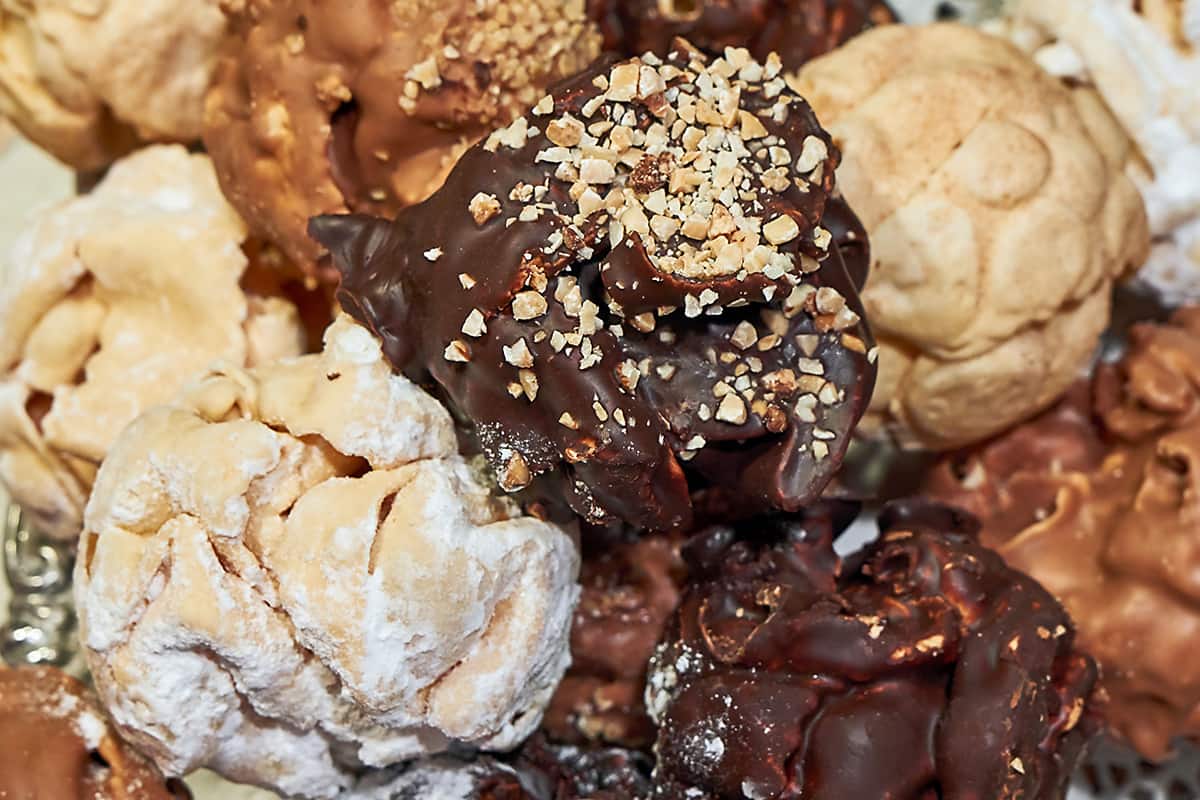 ローテンブルクは、シュネーバルという直径10cmほどの小麦粉を揚げた丸ドーナツのようなお菓子が有名です。お砂糖やチョコレート、シナモンなど、さまざまなトッピングの種類があります。また、緑色のボトルに入ったフランケンワインもローテンブルクの名産品。南ドイツ料理とあわせて、辛口で力強いフランケンワインを味わってみてください。