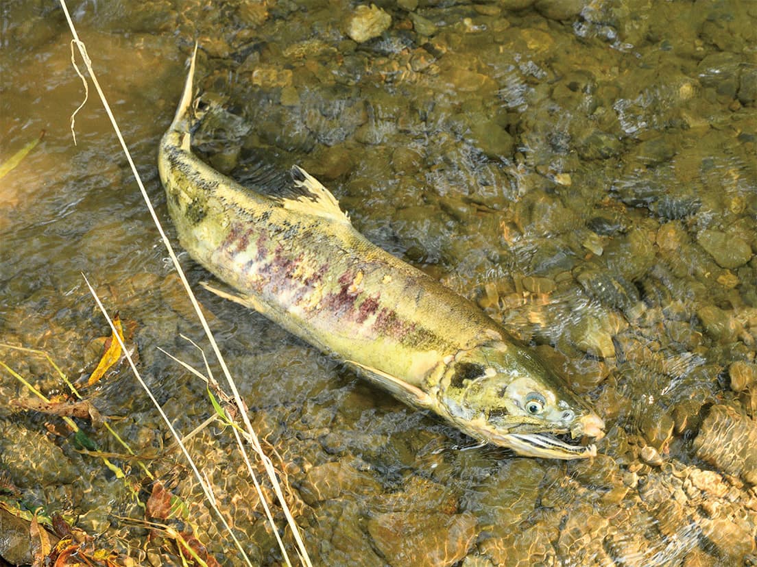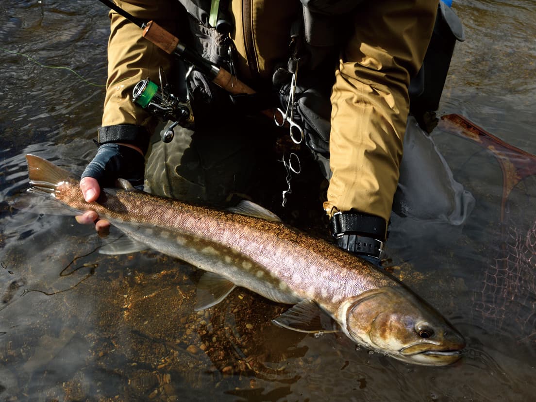 釣れるアメマスのサイズは、40cm台から60cmを超えるものまでさまざま。たとえサイズが小さくてもコンディションが抜群だからこそ、他の時期では味わえない強烈な引きを味わえます。なお、アメマスは本格的な秋の到来とともに婚姻色を帯び始め、地元では産卵のピークを迎えるタイミングでの釣りは控えるのがマナー。ただし、アメマスは産卵後も生きるので、その時期を過ぎた後は、川面が結氷するまで長く釣りを楽しむことができます。