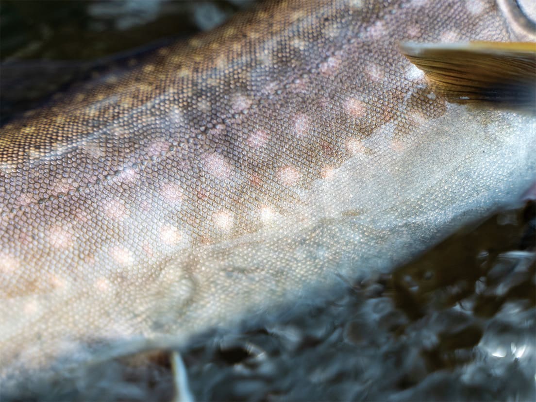 海でエサをたっぷり捕食したアメマスは、紡すい形で太く丸く肥えながら体は引き締まり、顔つきもいかつくなって、海で生き抜いてきた強さを感じさせます。アメマス特有の背中の虫食い模様や白斑も濃く明瞭に浮かび上がり、他の時期のアメマスとは明らかに違う迫力がみなぎっています。