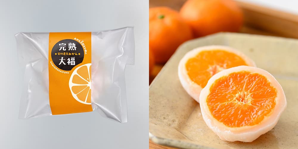 松山ロビー店スタッフ、宮内亜弓さんがおすすめしてくれたのは、愛媛の名産品であるみかんを使ったスイーツ「契約農家みかん完熟大福」。農家の女性4人が副業として始めた「津島あぐり工房」によるもので、プロが厳選したみかんをまるごと使い、白あんと一緒にやわらかな求肥で包んでいます。