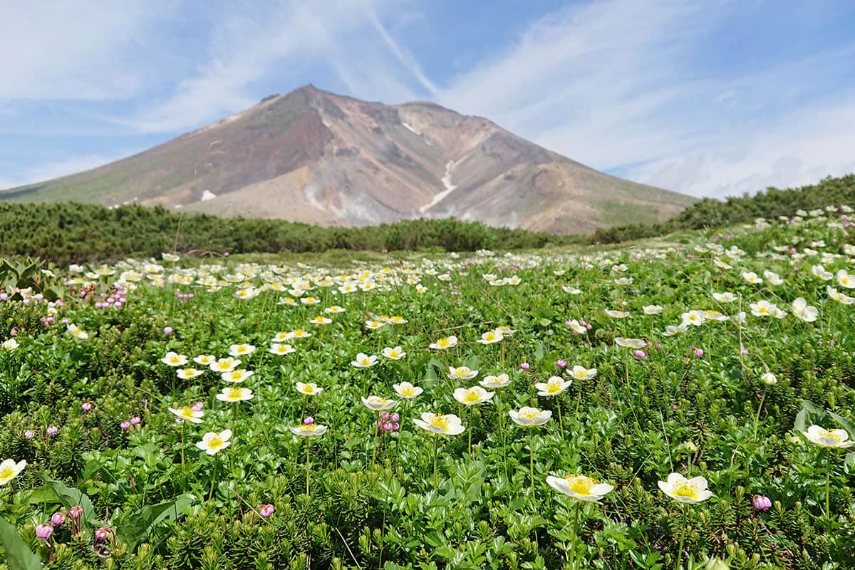 北海道の中央部に広がる大雪山連峰の主峰・大雪山旭岳。標高2,291mの北海道で最も高い山です。厳しい冬を過ぎると、芽吹きの春、そして高山植物が咲き誇る夏がやってきます。登山シーズンは6月下旬から10月初旬まで。空港から大雪山旭岳の麓まで車やバスで約1時間というアクセスの良さから、道外から日帰り登山で訪れる方も多いとか。登山初心者も気軽に楽しむことができるのは、大雪山旭岳ロープウェイに乗り、姿見駅で降りて、標高1,600mの姿見の池まで散策路を登るコース。姿見の池周辺では、6月上旬から8月中旬頃まで、白い花びらが可憐なキバナシャクナゲや、空を仰ぐように咲く白と黄色のチングルマなどの群落を見ることができます。