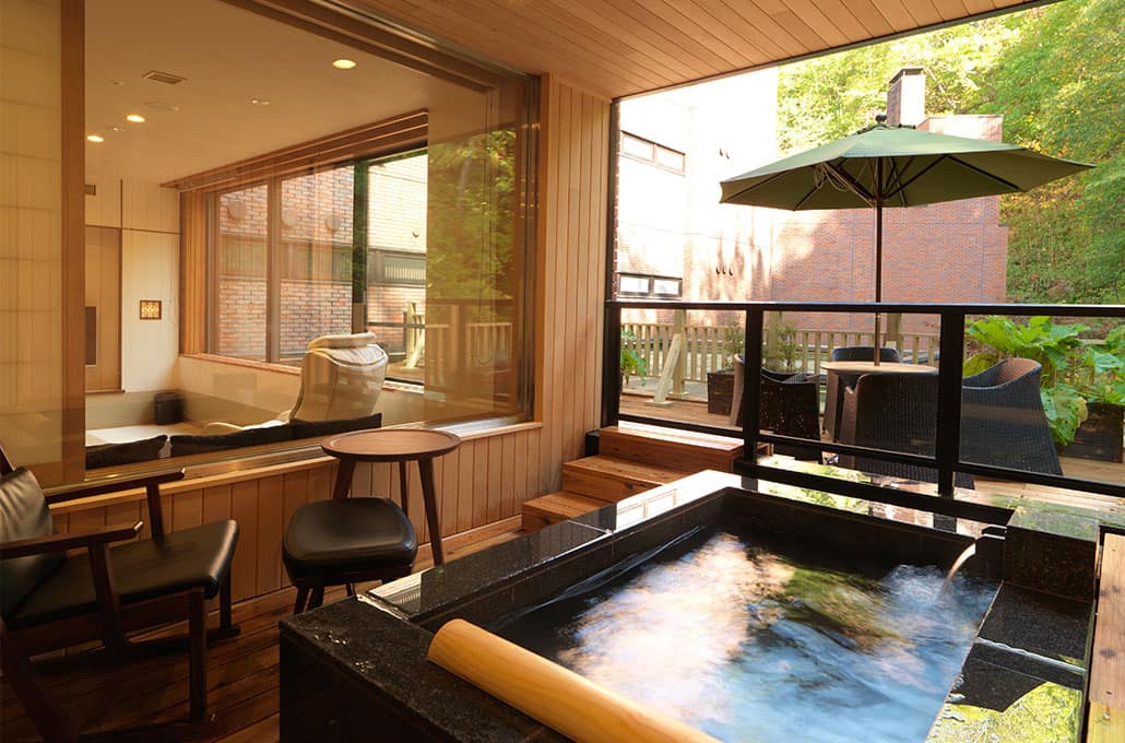 ニセコらしい自然のなかでのんびりするなら、静かな奥ニセコ昆布温泉で宿泊。JRニセコ駅から車で約15分の「ニセコ昆布温泉鶴雅別荘 杢の抄(もくのしょう)」は、木々に囲まれ、川のせせらぎに癒やされる別荘のような温泉旅館。温泉露天風呂付きの部屋で過ごせば、日常の疲れがするするとほどけていくようです。