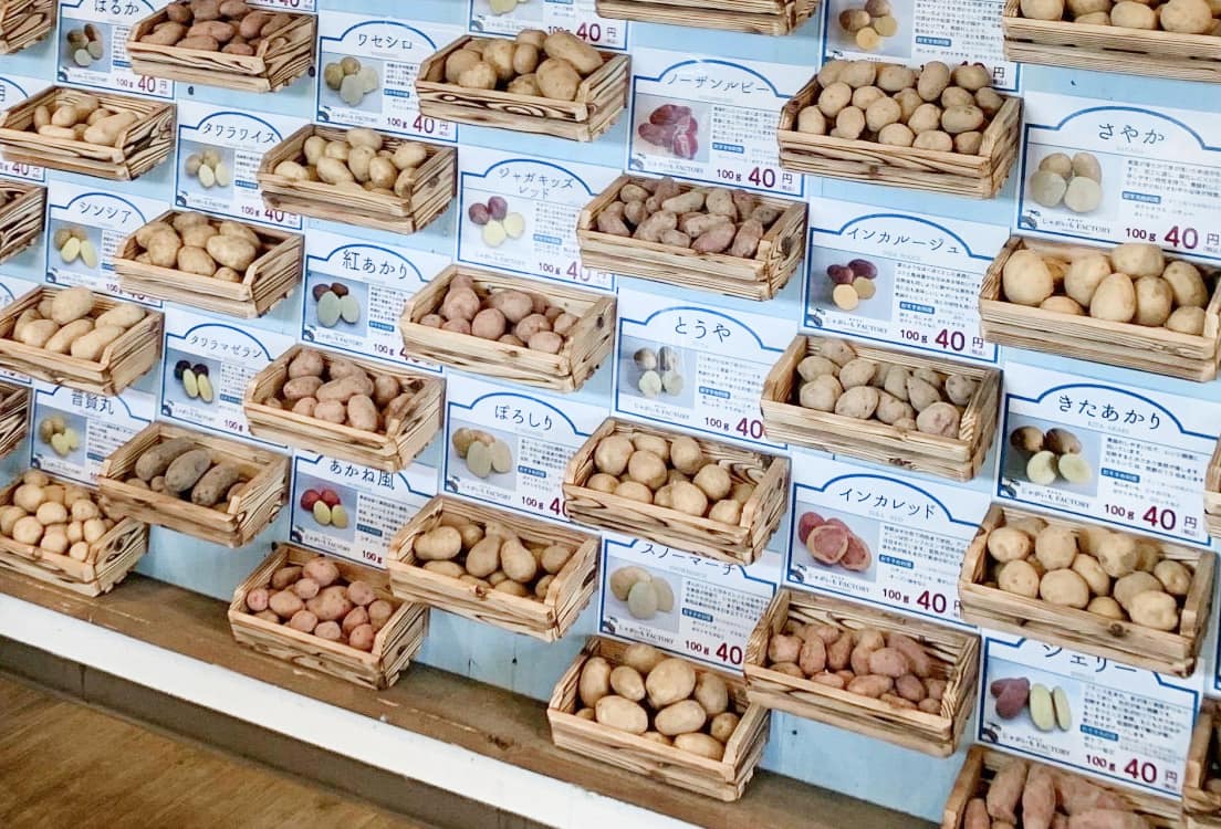 同店では、100グラム単位でジャガイモの量り売りも行っています。常時40〜50種類(品種ごとに無くなり次第終了)が並び、色やサイズ、形などを実際に比べながら購入可能。品種ごとに説明が添えられているため、料理の用途にあったものを選べます。生産者直営だからこそ実現可能な販売スタイルが多くの方に支持されています。