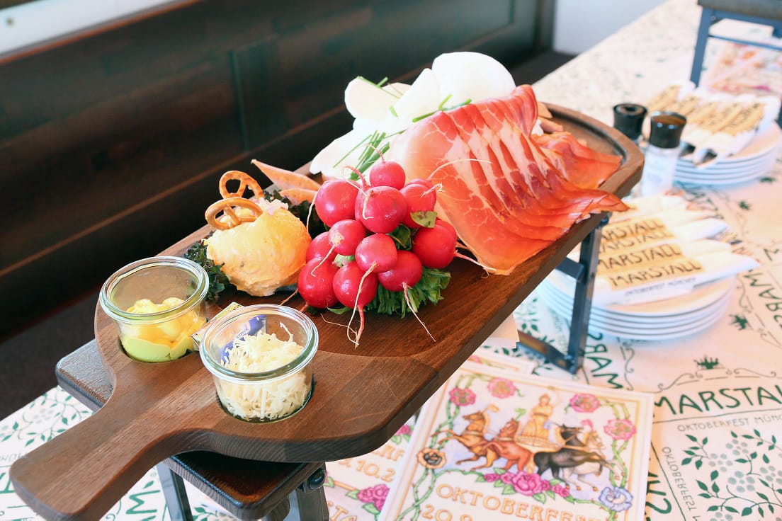 ビールとあわせて、ドイツの伝統的なグルメも楽しみたいところ。ドイツと言えば、プレッツェルやヴィーズン・ヘンドル(チキンの丸焼き)が有名です。そのほかにも、ヴァイスヴルスト(白ソーセージ)やシュヴァインスハクセ(豚の軟骨に煮込み)といったお肉好きにはたまらない料理が多数そろいます。メインの肉料理は1人前でもかなりのボリュームがあるため、何種類かを注文して数人でシェアして食べるのがおすすめです。