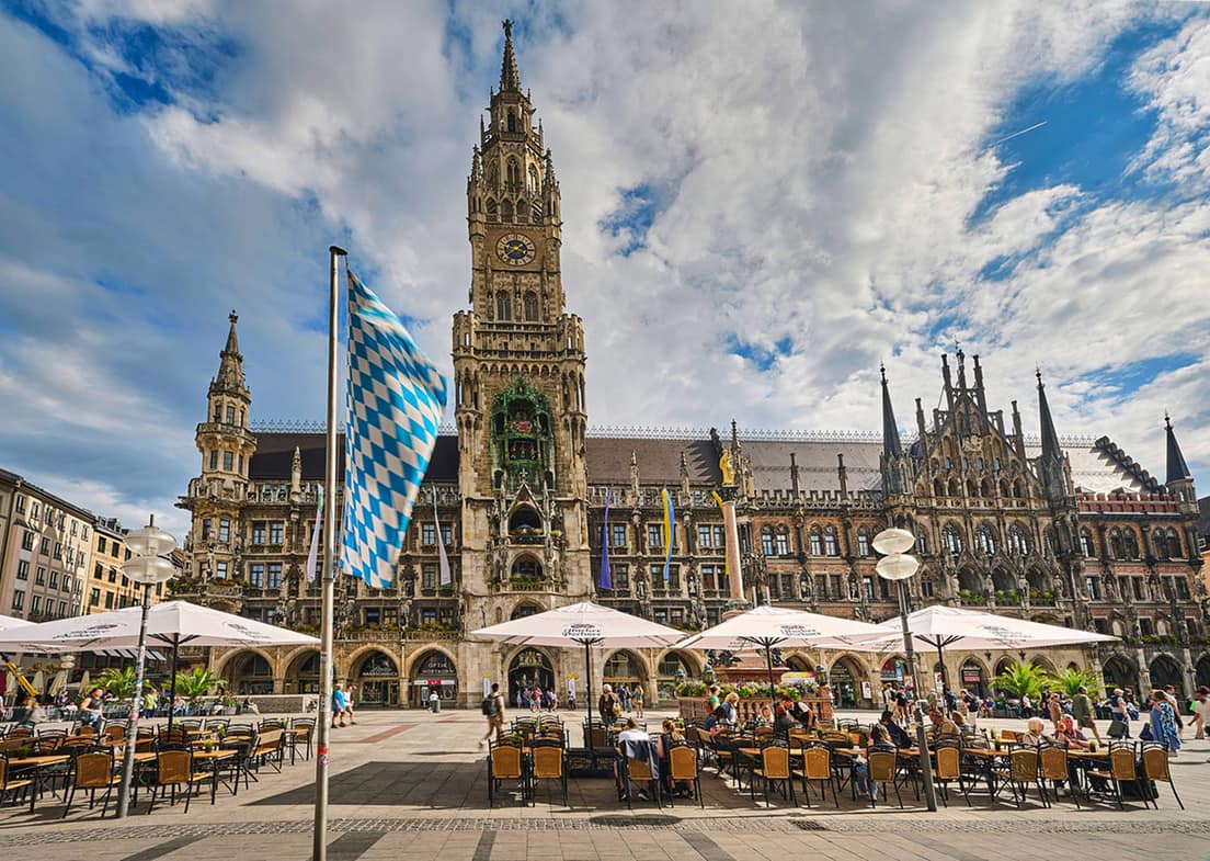 見どころは、ドイツ最大の仕掛け時計「グロッケンシュピール」。毎日午前11時と正午に(3~10月は17時も)カラクリ人形のショーが始まり、約10分間のパフォーマンスを楽しめます。市庁舎内は無料で見学することができ、地上85メートルの高さにある展望台(有料)からはミュンヘン市内を一望できます。