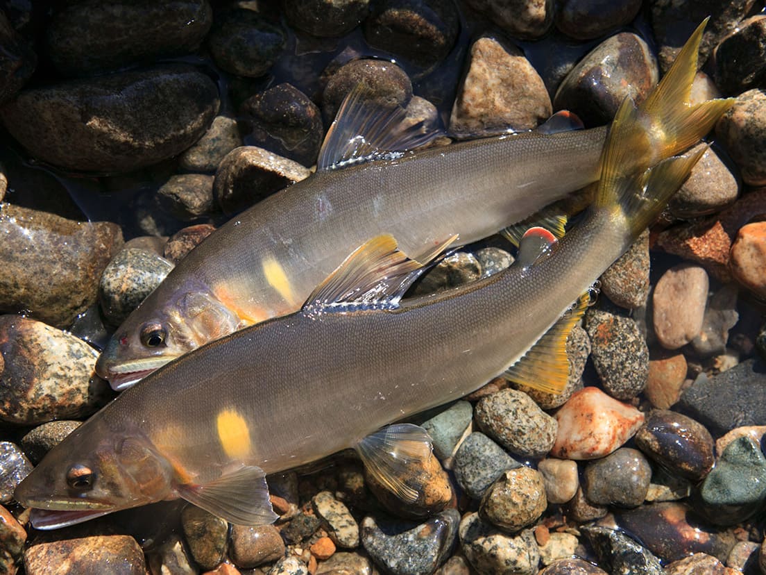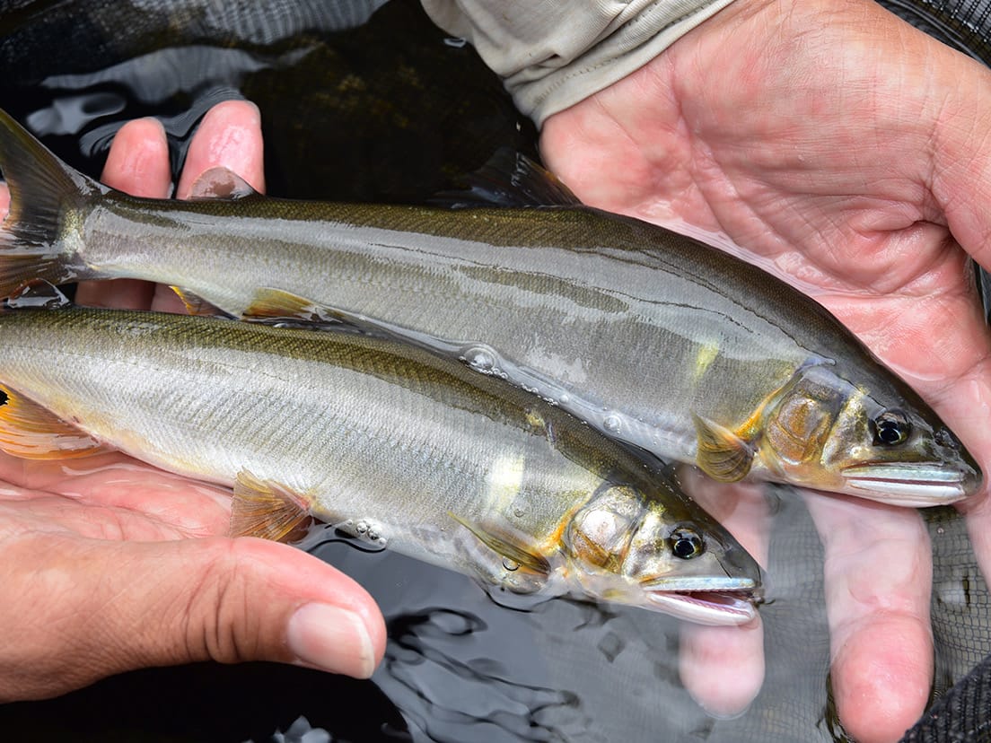 北陸の天然アユ釣りのシーズンは、例年、7月下旬頃からピークを迎えます。理由は初夏までは雪解けによる冷たい水が川に流入しているためで、お盆を過ぎて川の水温も上がりアユがしっかり成長してくると、全域でコンディションのよいアユが釣れるようになります。その後、アユが産卵に向けて川を下り始める前の9月の下旬頃までは楽しい釣りができます。