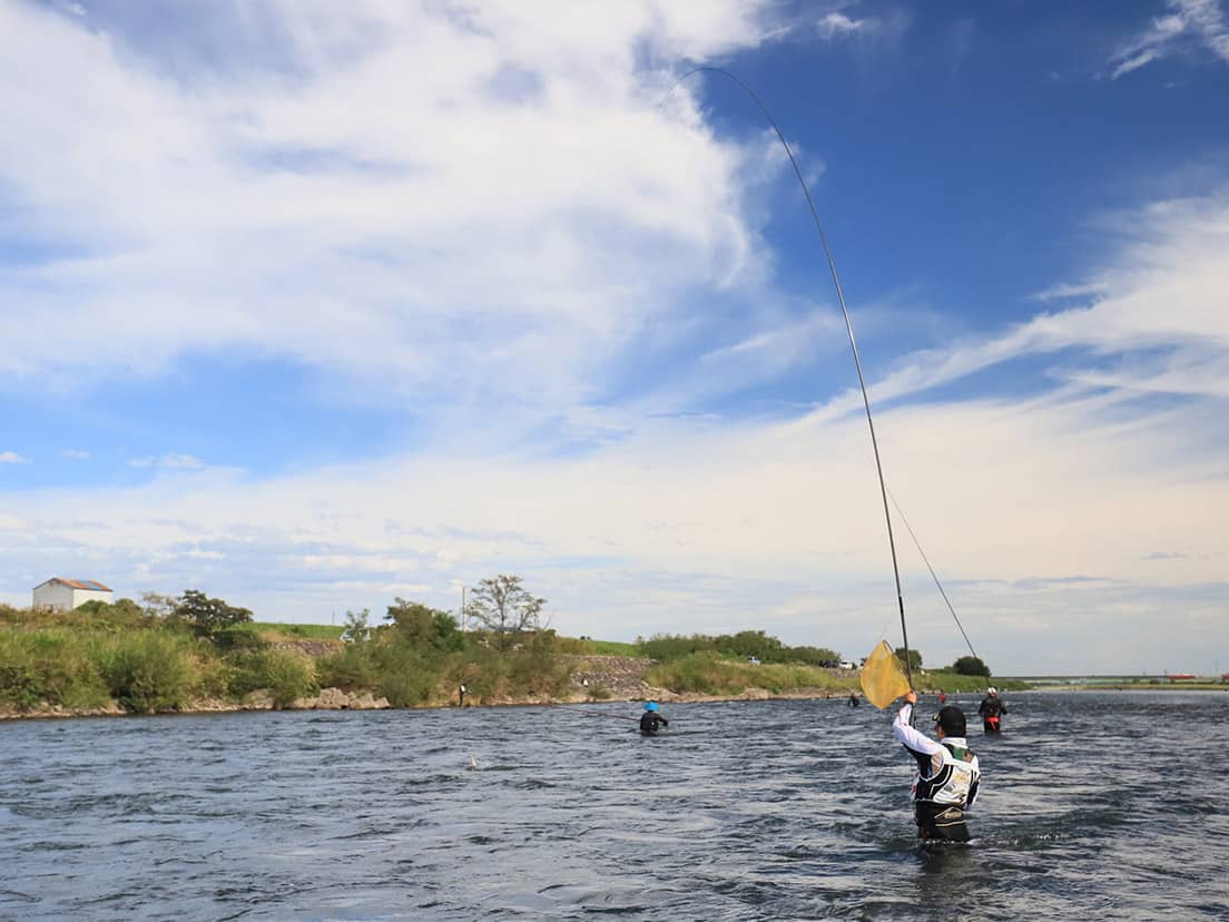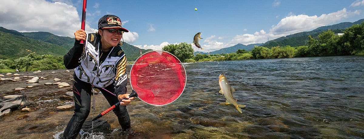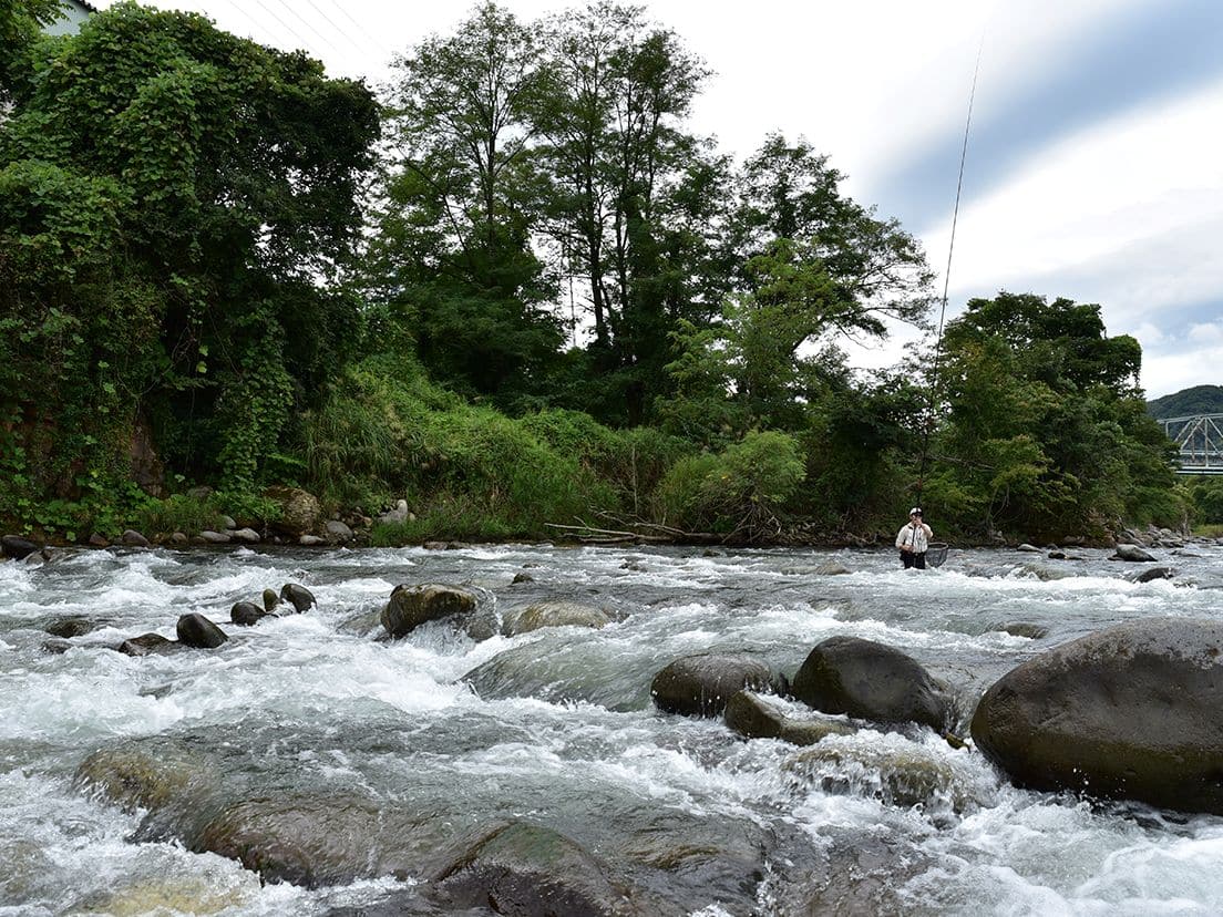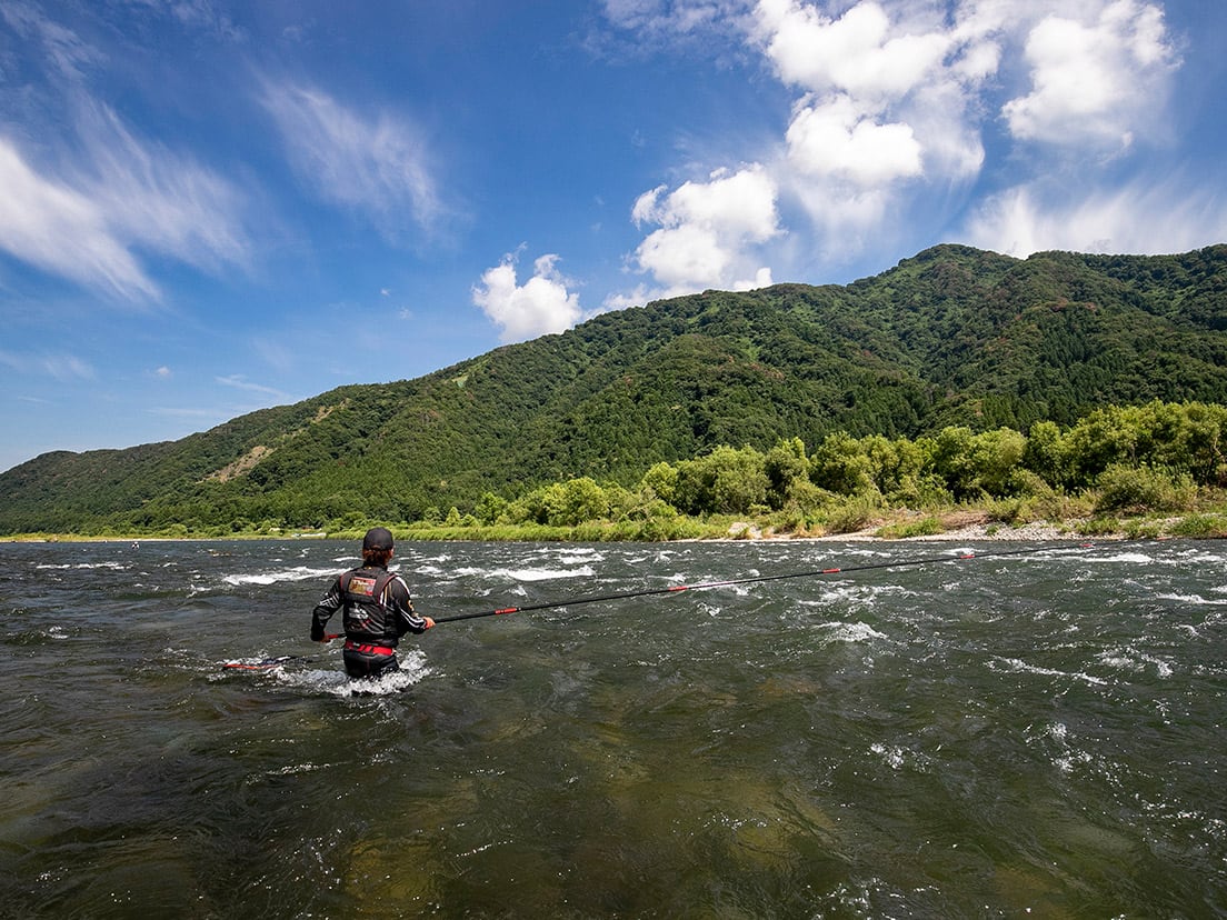 夏の青空の下、清らかな流れに立ち込んで魚を掛けるアユ釣り。生きたアユにハリの付いた仕掛けをセットし、川にいるアユに体当たりさせて掛ける技法には独特の面白さがあります。