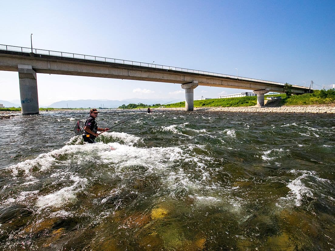 上流域の大沢野大橋周辺は岩盤が多い区間で、落差の大きな瀬も数多くあり、その下の中流域にあたる新婦大橋、新保大橋の前後は石も大きく、例年、安定した釣果が得られます。釣り人が最も集中する大人気スポットで、なかでも富山空港の目の前は、右岸に広い河川公園があり、入川場所や駐車場所に困りません。そこから下った婦中大橋より下流は川幅が広くなり石も小さくなりますが、アユが群れかたまる場所を見つけられると入れ掛かりが楽しめます。