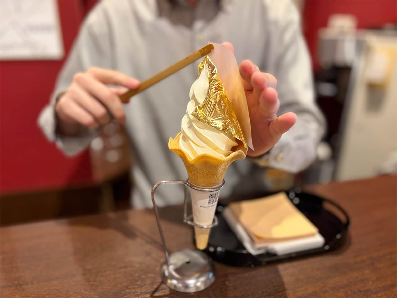 ひがし茶屋街には金箔グルメがたくさんありますが、その火付け役ともいえるのが「箔一」の金箔ソフトクリーム。なんと金箔を1枚そのまま使っているという大胆さ。フォトジェニックなソフトクリームなので、お店は観光客でたいへん賑わっていました。なお、ひがし茶屋街では食べ歩きがNGなので注意が必要です。箔一の店内はイートインスペースが充実しているので、休憩スポットにおすすめです。