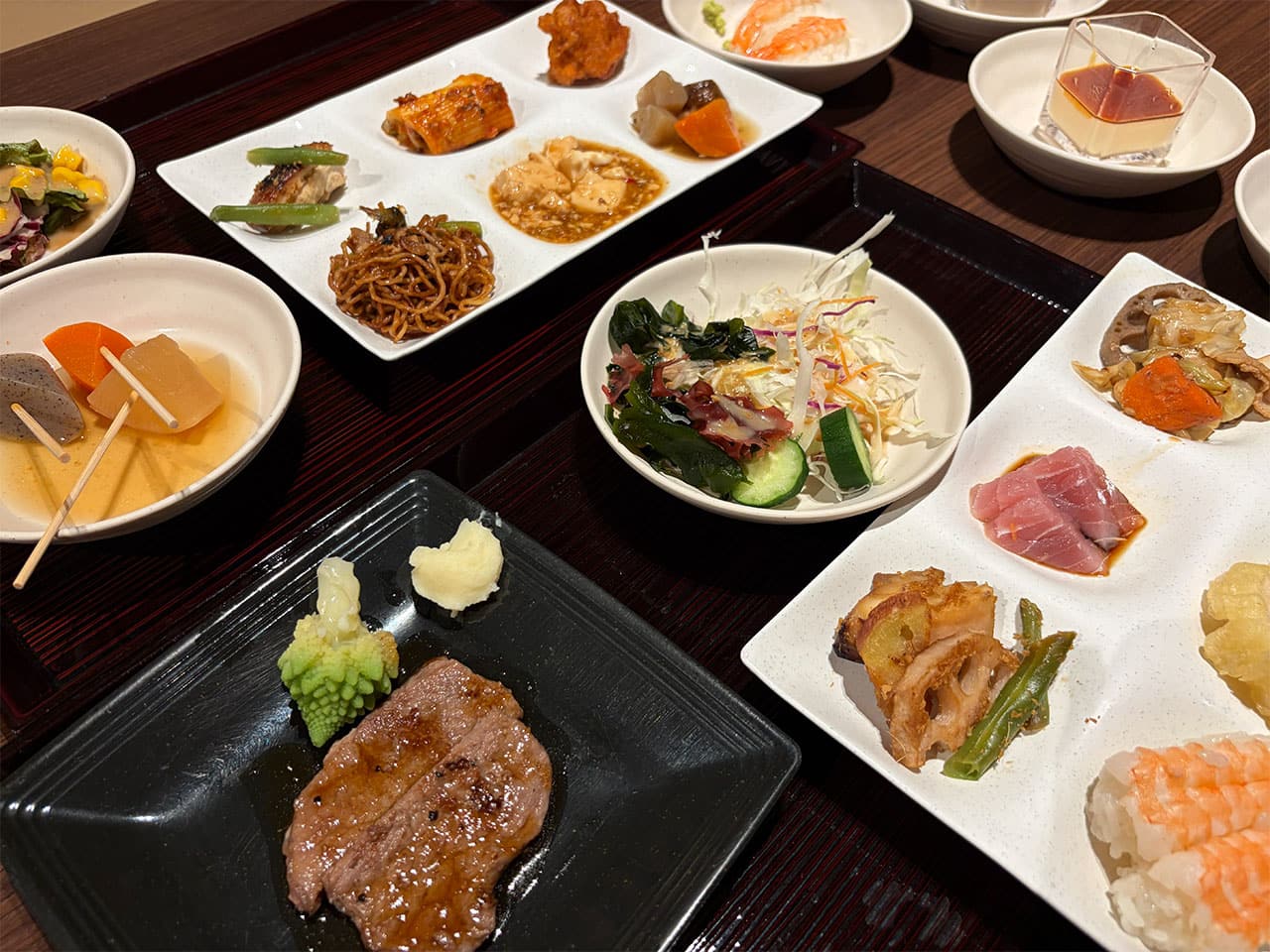 お待ちかねの食事はビュッフェです。夕食は約50種類のラインアップ。お寿司やお造りなどの海鮮、治部煮・めった汁・甘海老塩ラーメン・加賀棒茶プリンなどこの土地ならではのメニューもいただけます。さらにライブキッチンでの実演も見逃せません。揚げたての天ぷらやサーロインステーキがその場でつくられます。石川県の名物のどぐろの煮つけや能登牛ステーキなどの別注料理もあります。