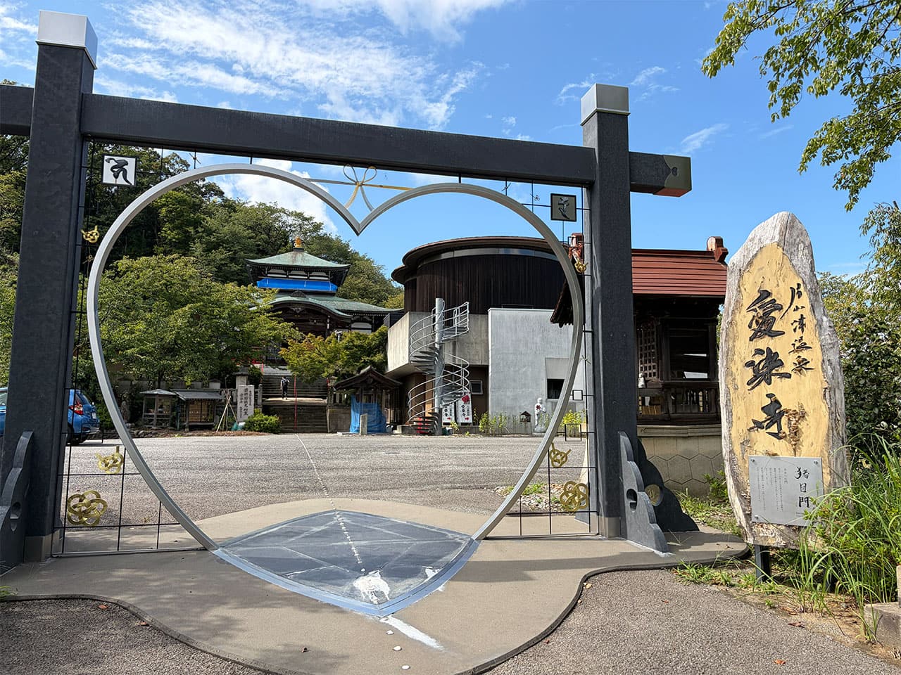 ホテルから加賀温泉駅まで戻り、そこからバスで「愛染寺」へ。片山津温泉の守護寺でありながら、縁結びのお寺としても知られています。石段をのぼるとハート形の山門がお迎えしてくれ、早くも縁結びのご利益に期待が高まります。お寺の護摩堂の本尊は「愛染明王」という縁結びの最上の仏です。一般的に護摩堂の本尊は「不動明王」が多いため、他にはなかなかなく珍しいそう。