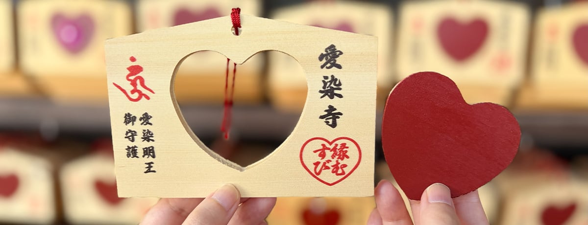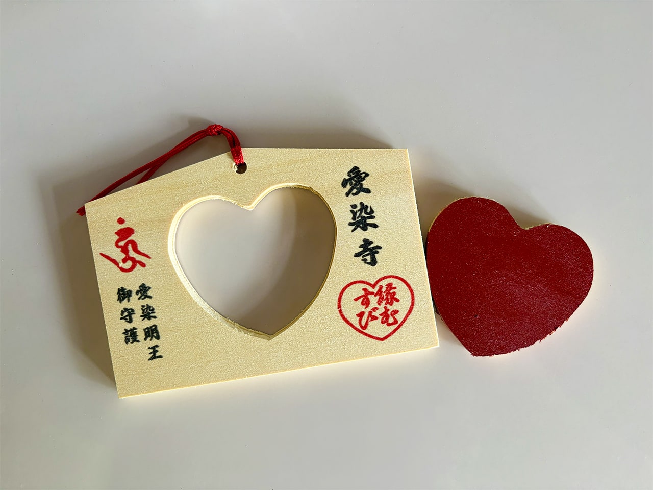縁結びの絵馬はハートのはめ込み式というオリジナルのもの。ハートの裏に願い事を書き、自分で絵馬にはめ込むことで完成します。"ご縁"を結ぶイメージを、ハートを合体させることで表現したというこの絵馬。一定方向からしかはめ込めないような設計にしていたり、ハートの赤色を山中漆器の職人さんが漆塗りしていたりと、3人がかりで作られているそうです。