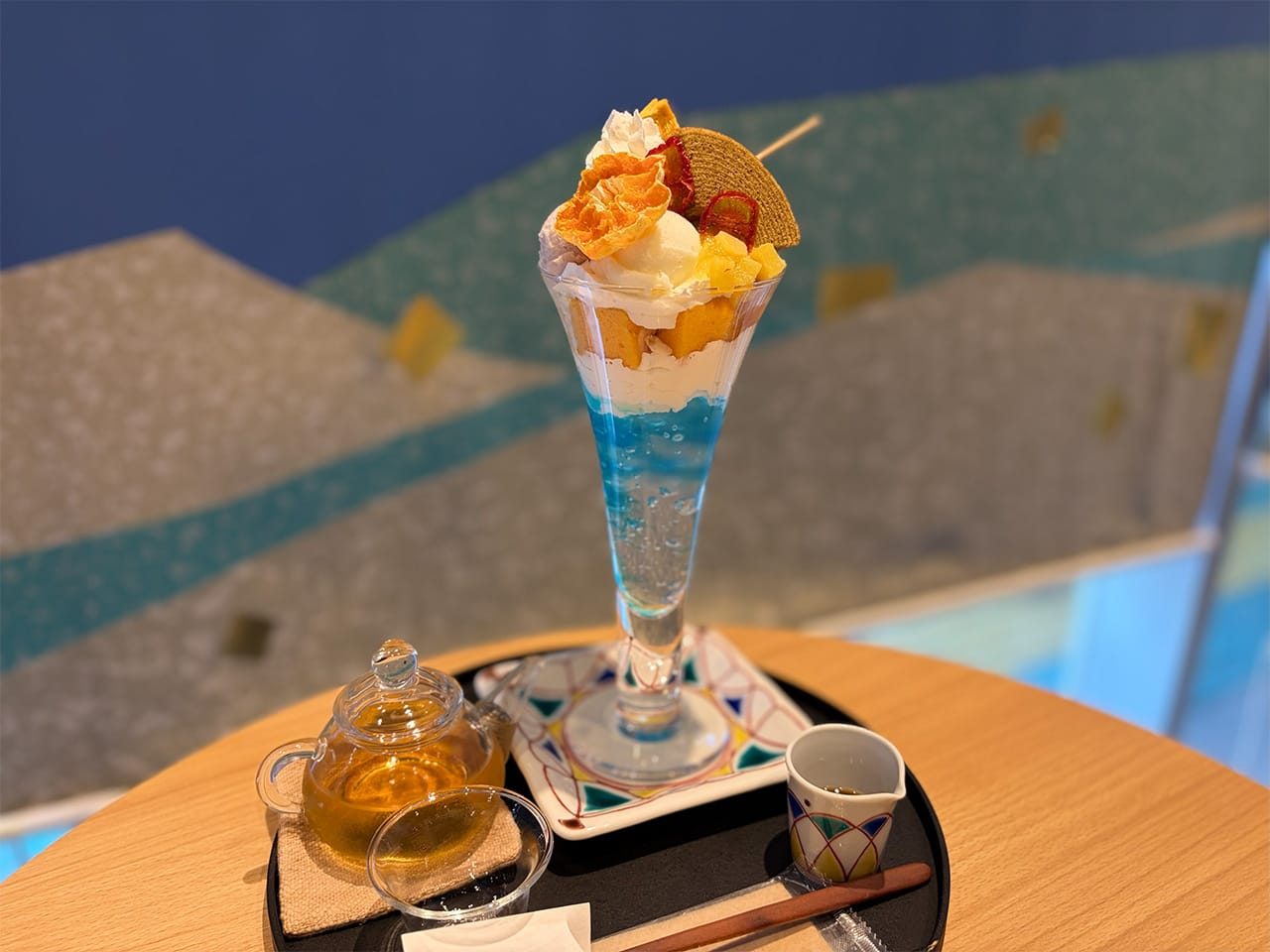 最後に加賀温泉駅の構内にある「Cafe&Bar髙乃蔵」で加賀パフェを楽しみました。加賀パフェは、加賀市が企画している地産地消と伝統芸能が融合したパフェのこと。材料も器もすべて地元のものを使うというこだわりです。市が毎年オファーするカフェや喫茶店など数店舗で、それぞれの個性豊かなパフェが楽しめます。
