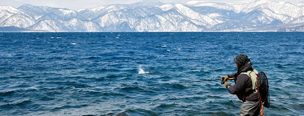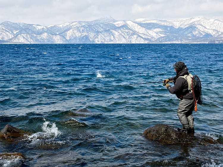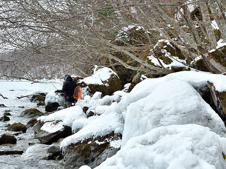 厳寒期の支笏湖はブラウントラウトが釣りの主役。水温が10℃を下回るくらいから岸に寄るといわれ、1年を通して見た場合は11〜12月が釣りのハイシーズンですが、気温が非常に低くなる1~2月を挟んで、春めいた日が増えてくる3月から再び釣り人の数が増え始めます。魚がルアーやフライをしばらく見ていなかったことでスレていないと考えられていて、1年の中でも大型のブラウントラウトが最も狙いやすい好機になります。