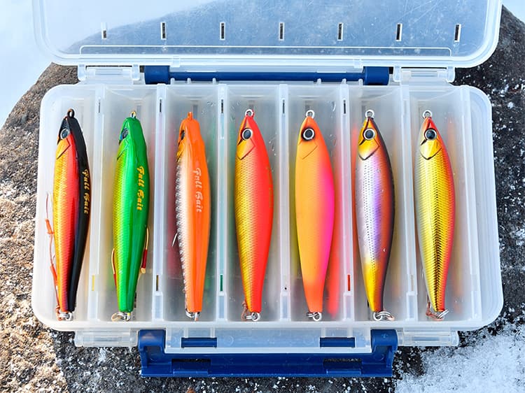 また、直接の寒さ対策ではありませんが、厳しいコンディションの中でもよく飛び実績もあるジグミノーは、支笏湖でも洞爺湖でも欠かせません。さらにカラーについてはタイプを問わずに「厳寒期は赤金系のルアーがよく釣れる」という実績があるので、少なくとも赤金系のジグミノーは必ず用意しておきたいアイテムです。