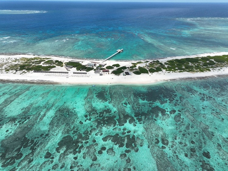 島はサンゴや貝のかけらが集まったコーラルサンドでできており、真っ白な砂浜と、エメラルドグリーンとブルーの海のグラデーションが、まるで海外のリゾート地のような雰囲気を演出しています。