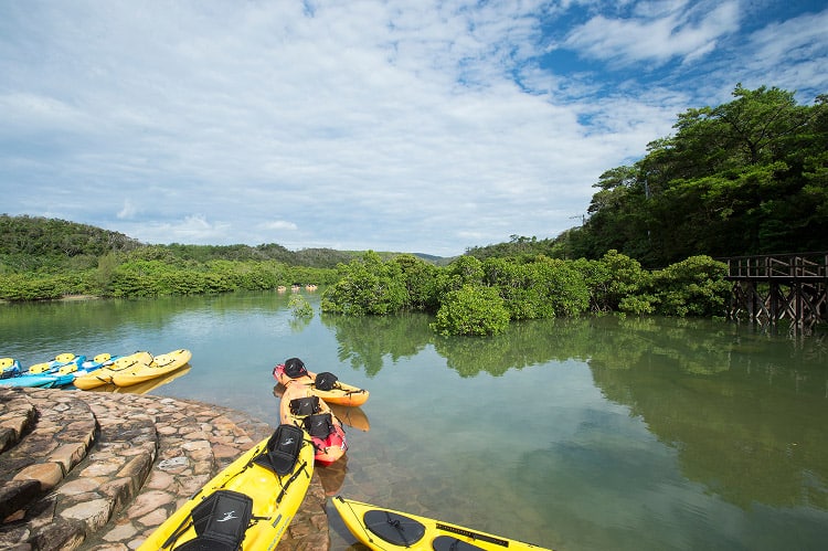 慶佐次川のほとりに位置する東村ふれあいヒルギ公園には、沖縄本島最大級のマングローブ(ヒルギ)林が広がっています。園内は全長およそ300mの遊歩道が敷かれており、ヒルギ林のあいだを貫く木製の遊歩道をゆっくりと散策して楽しむのもおすすめです。運が良ければ、ヒルギ林の中に暮らす貴重な生き物を見つけることができるかもしれません。また、ガイドと一緒にカヌーに乗って、川からマングローブを満喫するカヌーツアー(有料)も人気のアクティビティです。