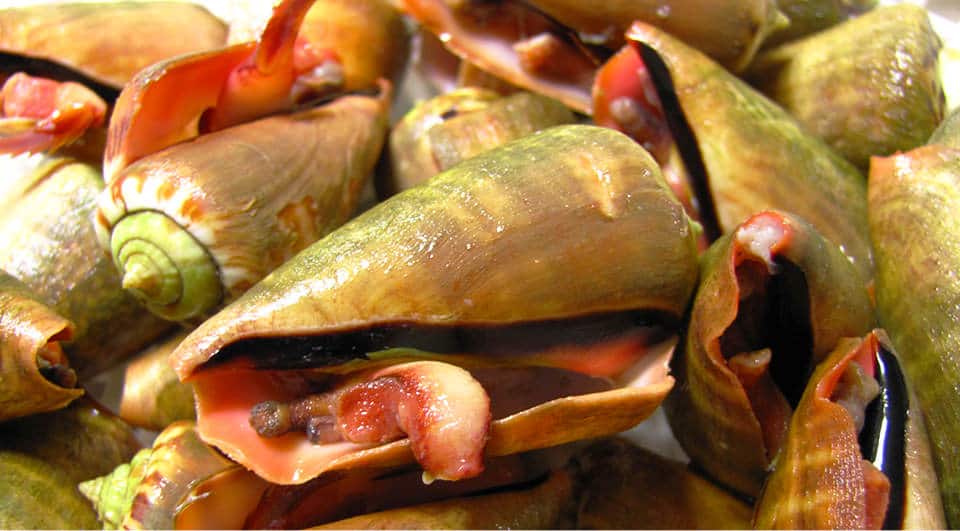 奄美地方で一番親しまれているといってよい、天然の食用貝がトビンニャ。和名はマガキガイといい、「ニャ」は奄美の言葉で貝を指します。長さ5cmほどの巻貝ですが、ツメを使ってリーフ(サンゴや岩でできた浅い海の広がる礁)の中の砂地底をピョンピョン跳ねまわるため、跳ぶ貝、「トビンニャ」と呼ばれるようになったといわれます。