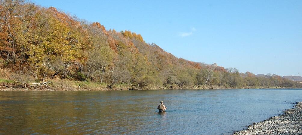 十勝川は、それらの川に比べると、アメマスの数こそ少ないものの、「超」の付く大ものがねらえる川として人気がある。十勝川の上流域と中流域の本流、そして支流は野生のニジマスの楽園としても屈指だが、晩秋から初冬のこれからの季節、下流部ではアメマスの反応がよくなる。