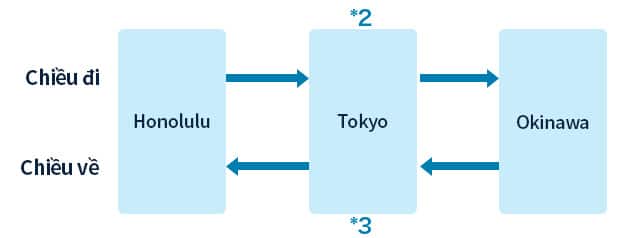 Tokyo (Vùng 1) đến Honolulu (Vùng 5) đến Los Angeles (Vùng 6) đến Tokyo (Vùng 1)