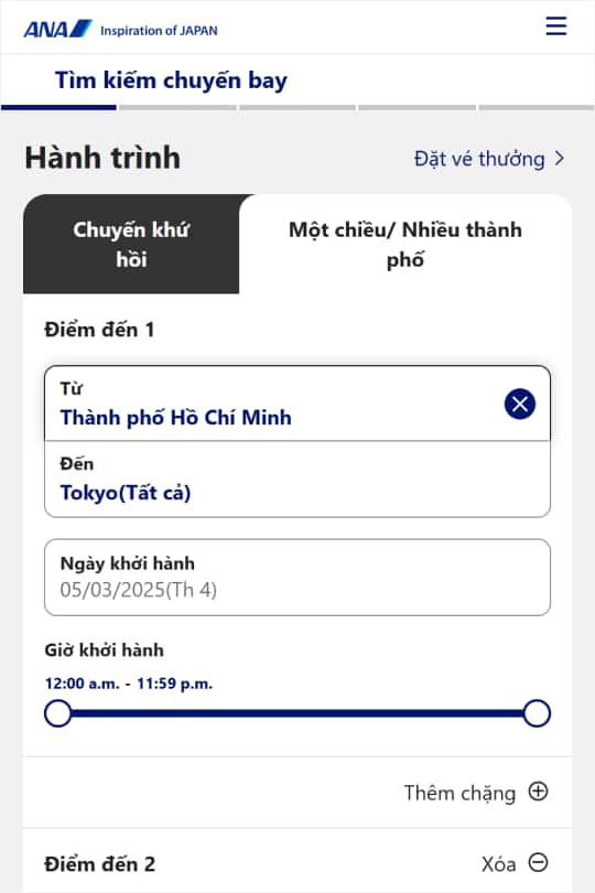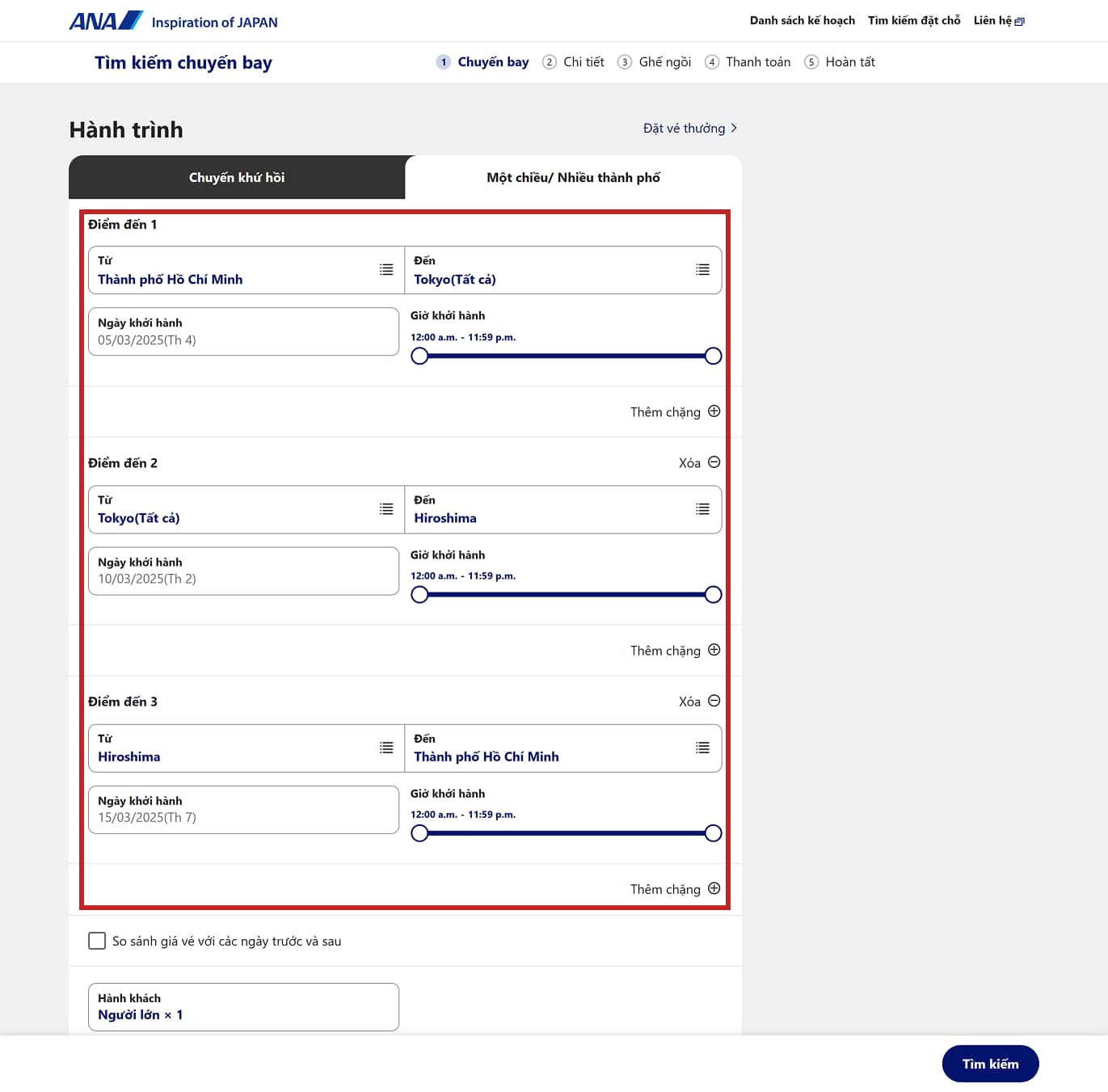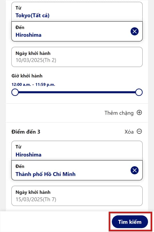 2. Nhập ngày đi và điểm đến tương ứng của bạn. Kiểm tra lại hành trình và chọn "Tìm kiếm".
