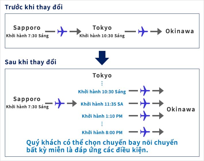 Khi quá cảnh giữa điểm khởi hành và điểm đến cuối bằng sân bay nối chuyến do ANA quy định, hành trình được xem là chặng đơn. Nhiều tùy chọn chuyến bay đặt trước hơn bao giờ hết!
