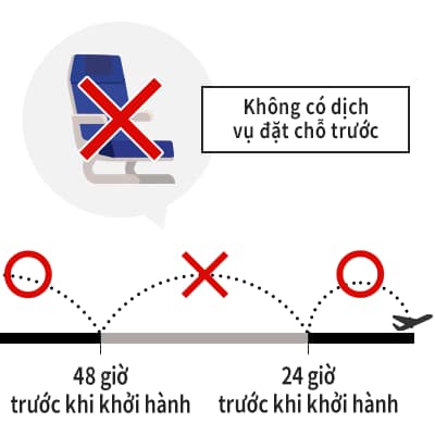 Đối với chuyến bay khởi hành từ sân bay sử dụng hệ thống cũ, không thể đặt chỗ từ 48 đến 24 giờ trước giờ khởi hành. Đối với giá vé cho phép Đặt chỗ trước, quý khách phải đặt chỗ trong không quá 48 giờ trước giờ khởi hành, hoặc khi hoàn thành làm thủ tục trực tuyến hoặc tại quầy sân bay.