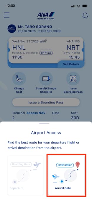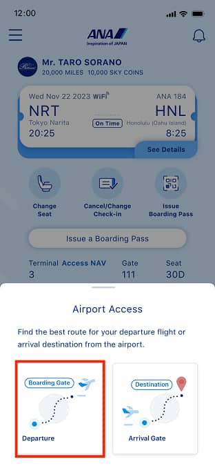 Chọn Cách ra vào sân bay từ màn hình chính của ứng dụng ANA chính thức.