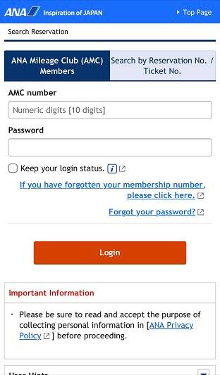 Đăng nhập qua trang Xem đặt chỗ trên trang web của ANA.