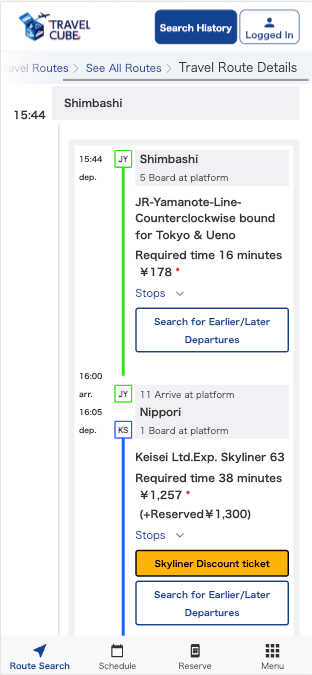 Trên màn hình này, quý khách có thể xác nhận giờ khởi hành theo lịch và thông tin đường đi đến đích đến cuối của quý khách.