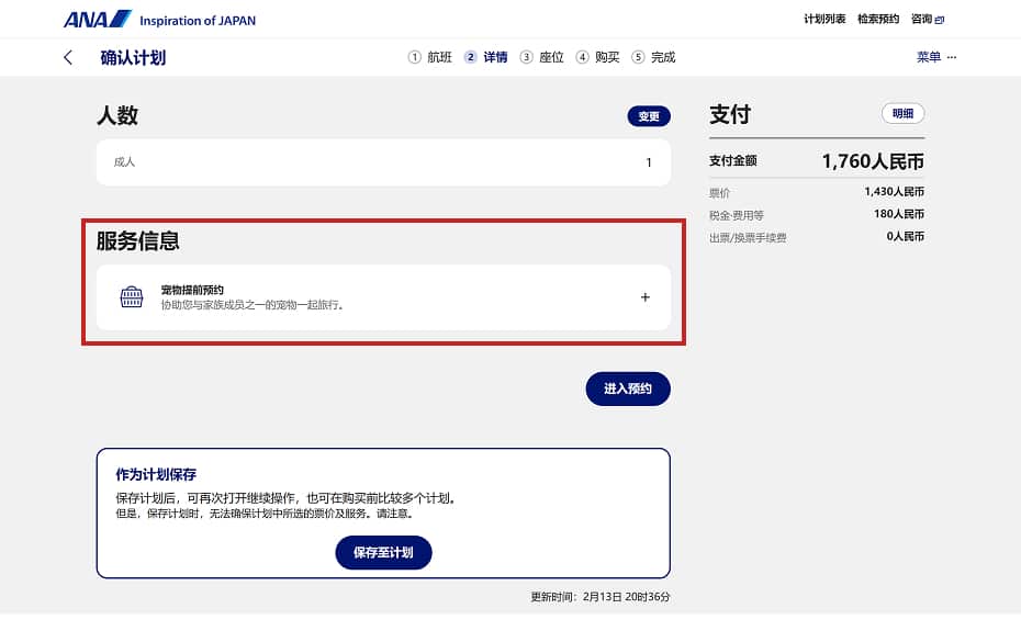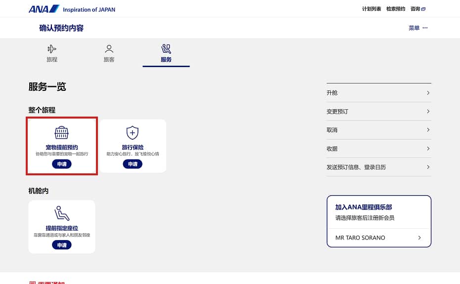 1:请通过“旅程详情”或“确认预约内容”的“服务”选项卡进入“宠物提前预约”画面。