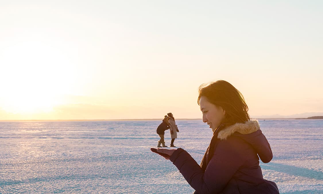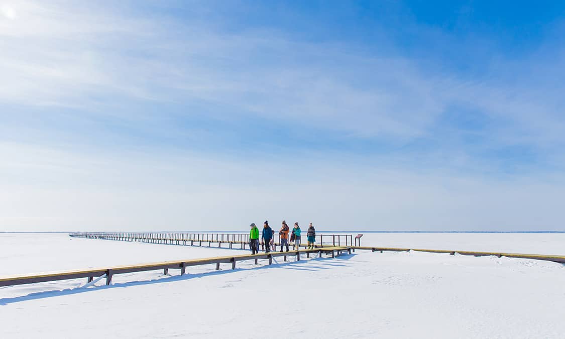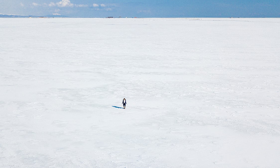 北海道东部野付半岛是与鄂霍次克海连接的半岛,全长26公里。1月至3月中旬,野付半岛内湾结冰,形成一望无际的冰面地平线,因此得名“冰平线”。穿越冰平线就是穿着雪地靴,在海上漫步的冬季体验旅游项目。