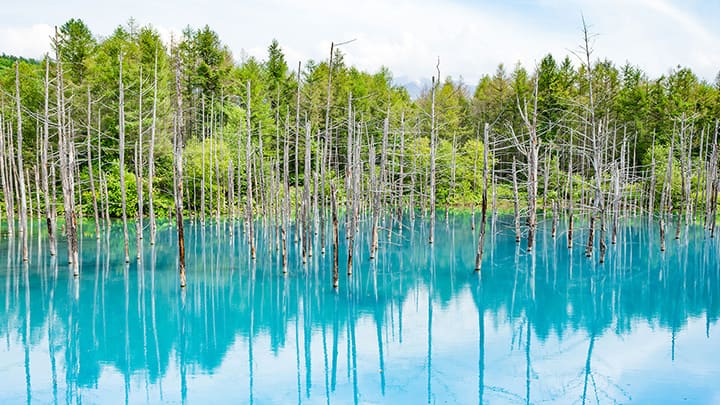 从美瑛站乘坐道北巴士约 20 分钟后在“白金青池入口”下车,接着步行约 10 分钟。