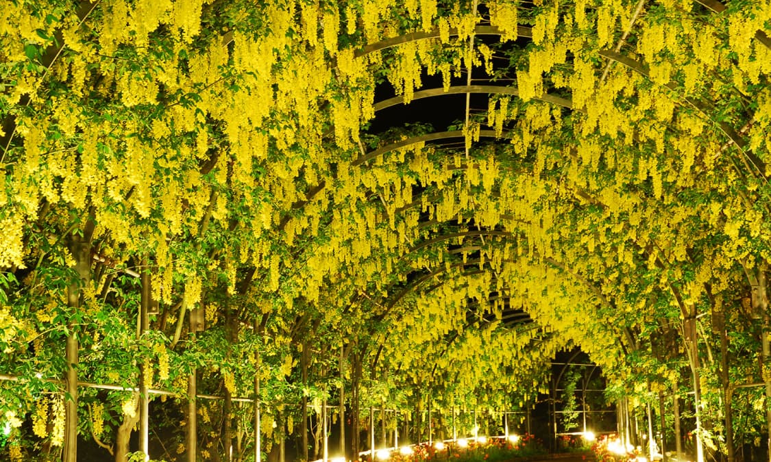 在栃木县足利市的足利花卉公园,被选为点亮的紫藤花和日本三大彩灯的“光之花庭院”而闻名。幻想般气氛的夜晚灯光秀也很好看。在四季盛开的花卉园内,春天树龄超过150年的“奇迹之藤”,就像詹姆斯卡梅隆导演的电影“阿凡达”中的“灵魂之木”一样,被CNN选为“10处世界梦幻旅行目的地(2014)”。