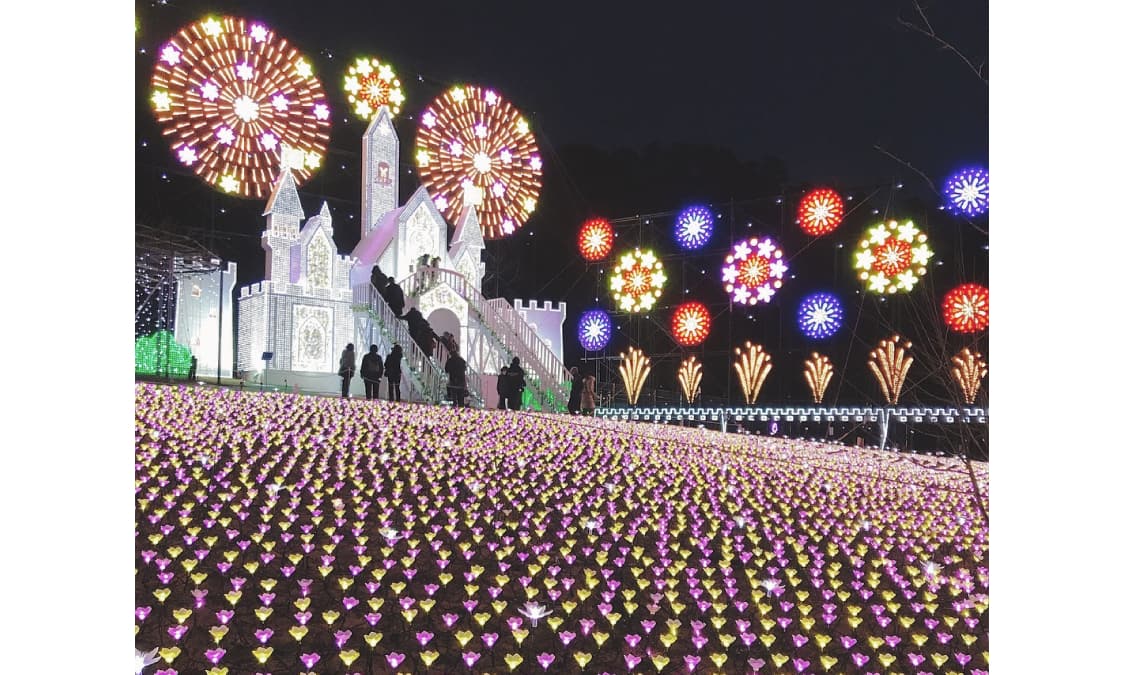 前面展开的花圃和以白色为基调设计的花城堡,与音乐一起在其背景上燃放花型烟花,这是多么美丽的景象。