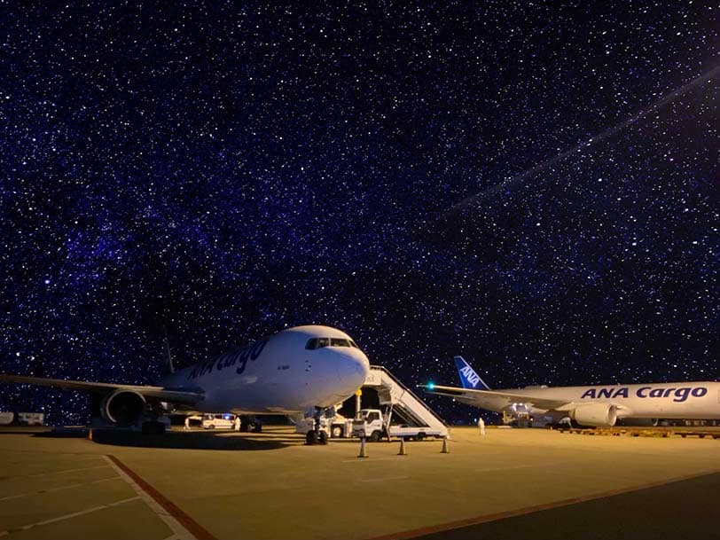我拍摄的是飘雪的夜空下,停放在停机坪上的ANA货机。