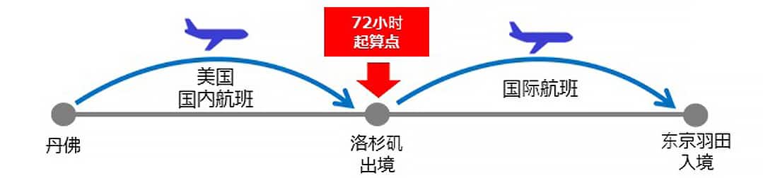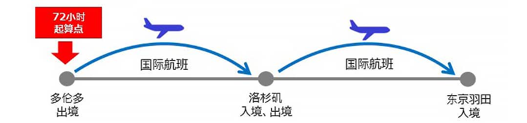 多伦多/出境ー(国际航班)ー洛杉矶/入境、出境、72小时起算点ー(国际航班)ー东京羽田/入境