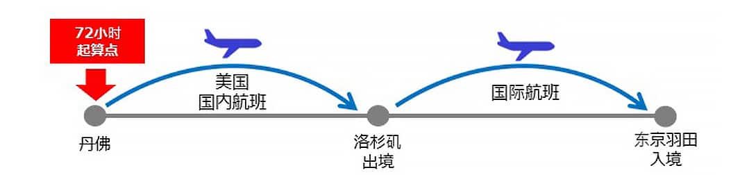 丹佛ー(美国国内航班)ー洛杉矶出境、72小时起算点ー东京羽田/入境