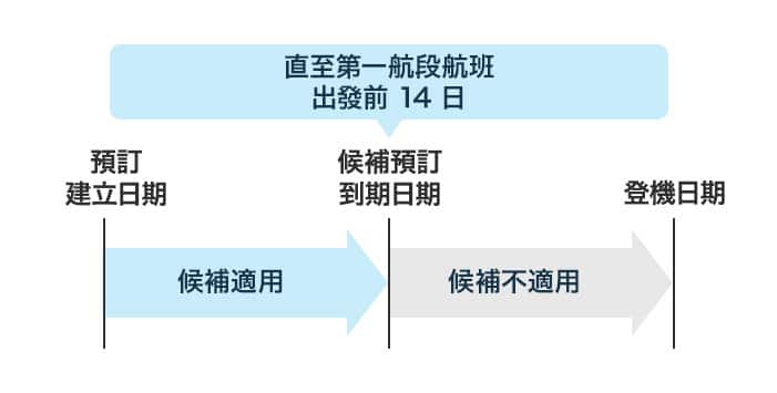 例 1:如果於 8 月 1 日由成田出發至新加坡的航班座位已獲確認,則不能列入 8 月 2 日出發的同一航班之候補名單。