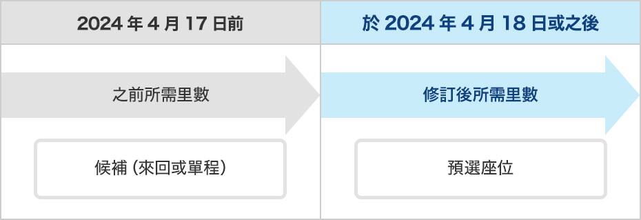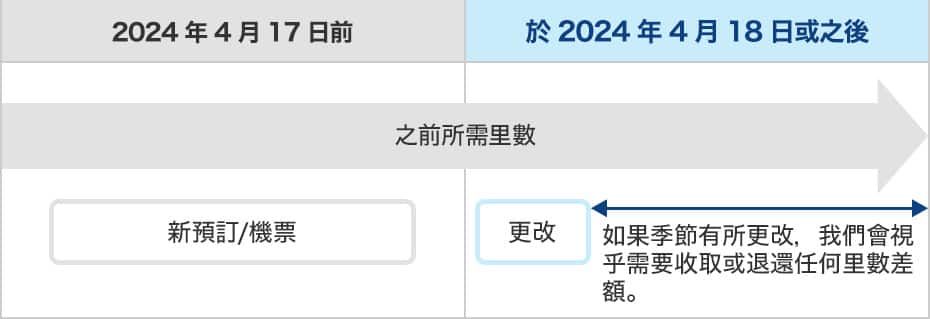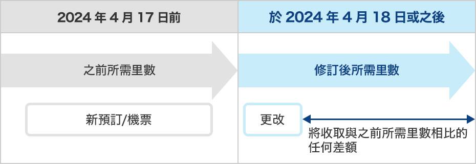 之前或修訂後所需里數是否適用將取決於新預訂/機票、預訂後更改或申請可用座位候補的時間。