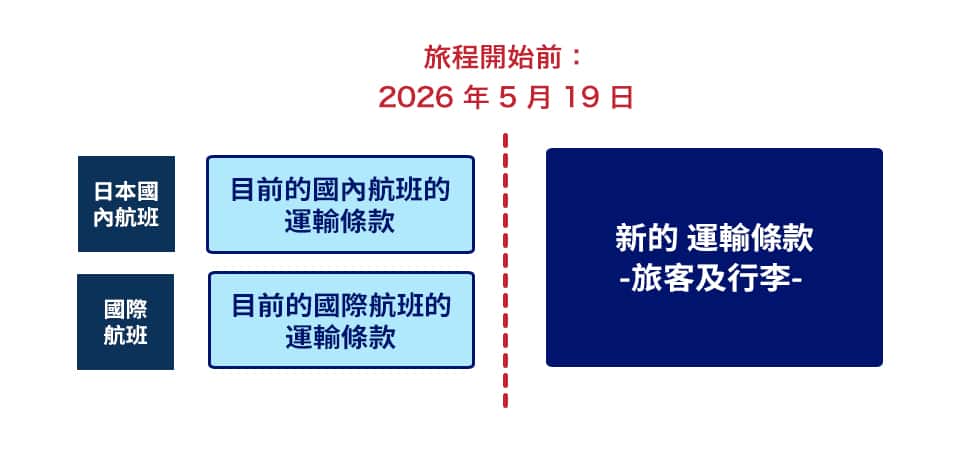 適用於日本國內航班的運輸條款及細則將從出發日期當日有效的條款及細則更改為旅程開始日期當日有效的條款及細則。