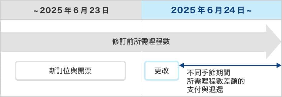 關於適用修訂前或修訂後所需哩程數,會根據全新預訂與兌換、預訂後更改,以及候補機位的時間點而異,請查看下方資訊詳加確認。