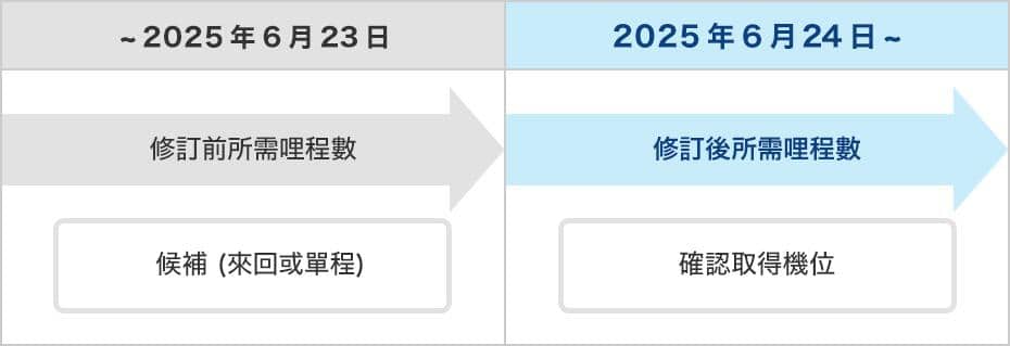 自 2025 年 6 月 24 日 (二) 0:00 (日本時間) 起預訂、兌換的酬賓獎勵機票將適用修訂後之所需哩程數。