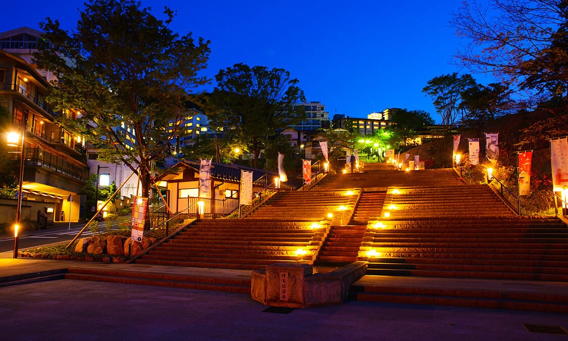 伊香保溫泉是群馬的代表性名湯,從赤城自然園開車約 30 分鐘可抵達。街道約長 300 公尺,並以 365 階的石階為中心綿延展開,營造出獨特風情。溫泉分為特殊湯色的「黃金之湯」與無色透明的「白銀之湯」。登上石梯,映入眼簾的是伊香保神社及以紅葉聞名的河鹿橋。溫泉饅頭茶色的麵皮像是仿造黃金之湯的顏色製成,而此製法的發祥地據傳正是伊香保溫泉。