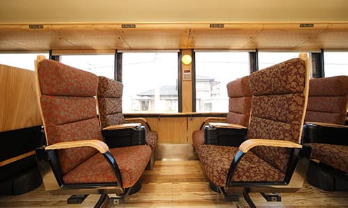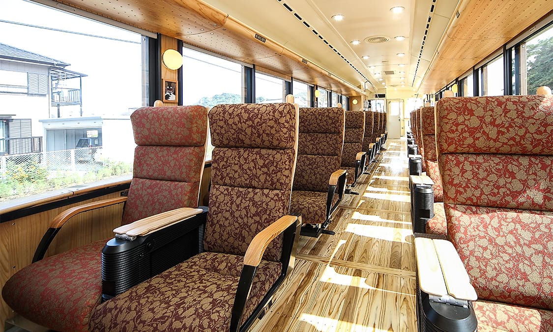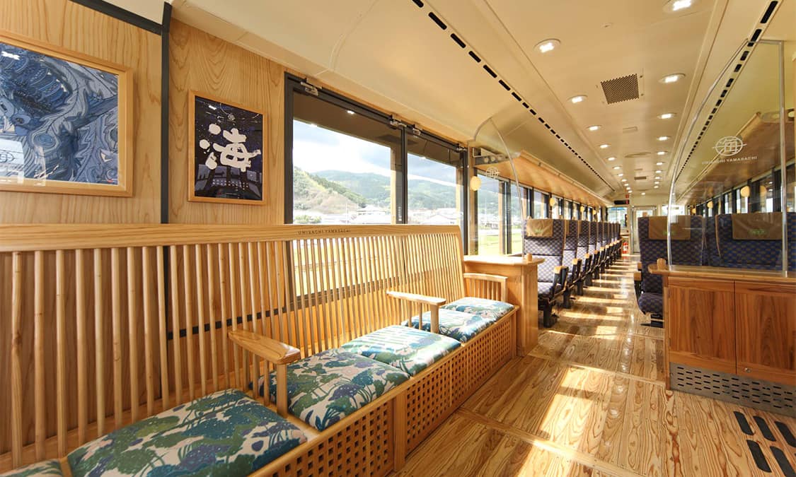 南國太陽從大大的車窗灑落,海幸山幸是在宮崎藍色大海及飫肥杉林中奔馳的度假特級列車。列車大量使用當地名產飫肥杉,散發木頭特有的溫暖情調。