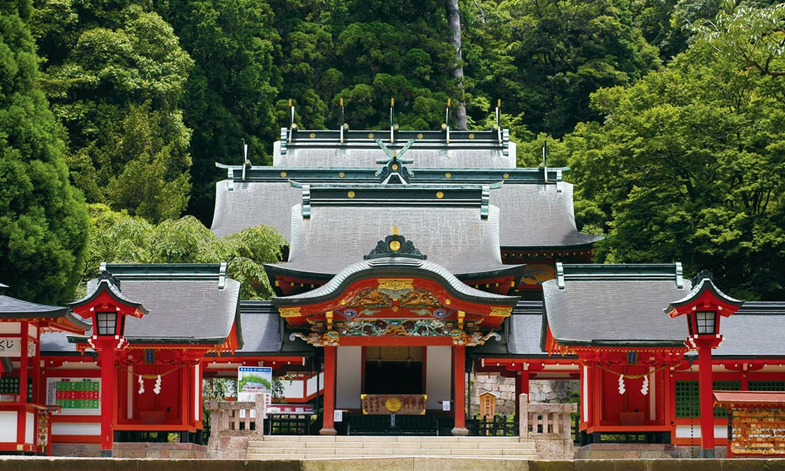 穿過霧島神宮的朱紅色鳥居,身穿和服漫步於參道的樹林中參拜,細細感受。